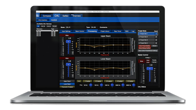 Функции и возможности, предлагаемые аппаратными средствами Galileo и CAL не имели бы смысла без продвинутой, всеобъемлющей, интуитивно понятной системы управления. Программное обеспечение Meyer Sound Compass полностью отвечает поставленной задаче. Графический интерфейс Compass — это результат долгих лет работы в области оптимизации управления сложными системами. На выбор пользователя предлагаются приложения для ОС Mac и Windows.