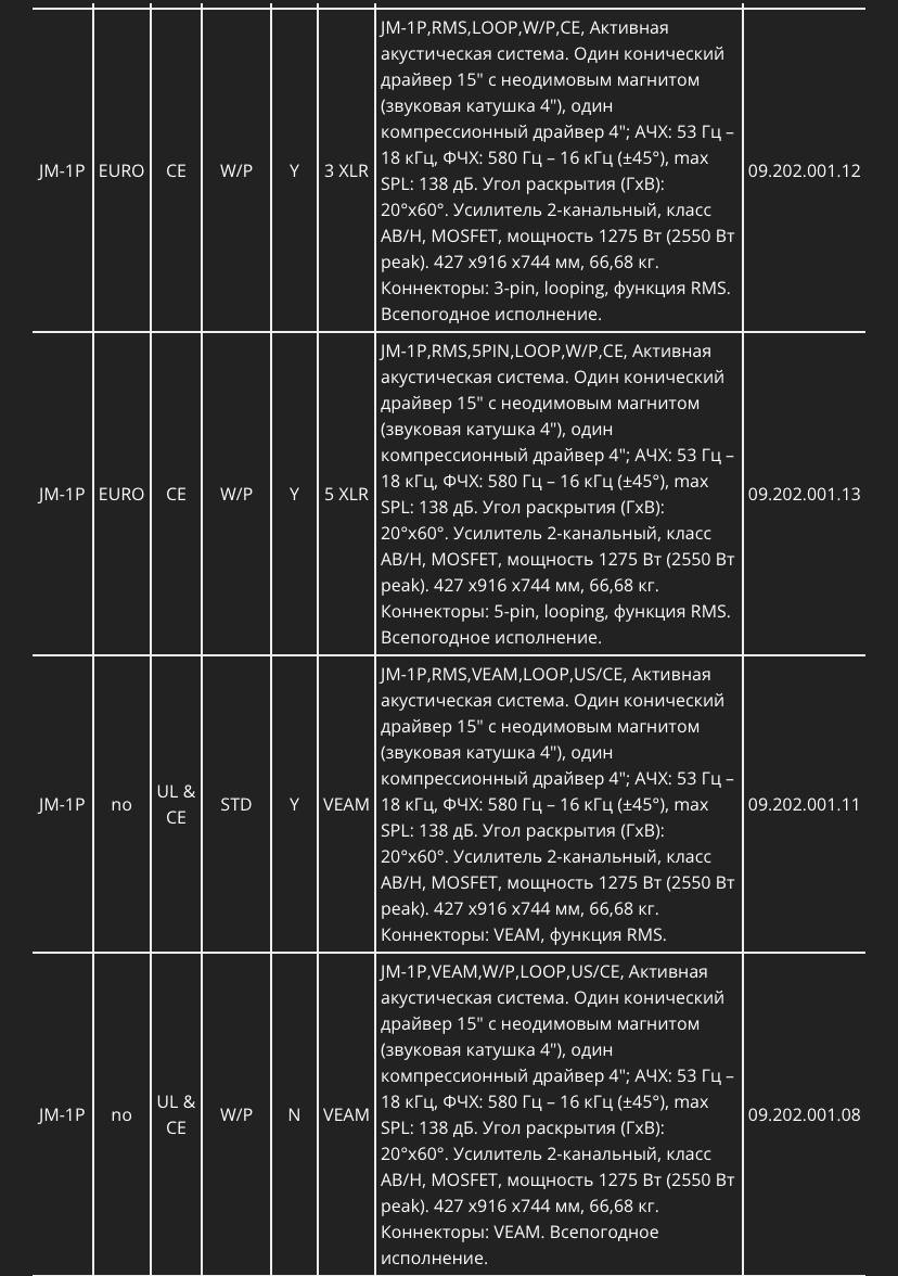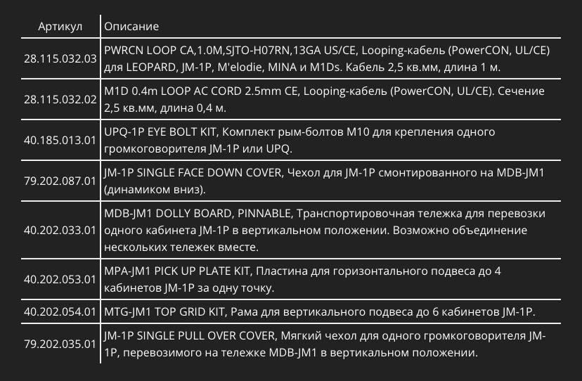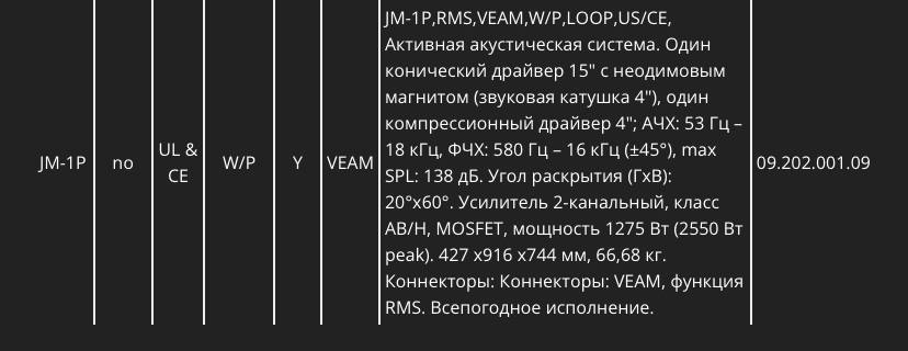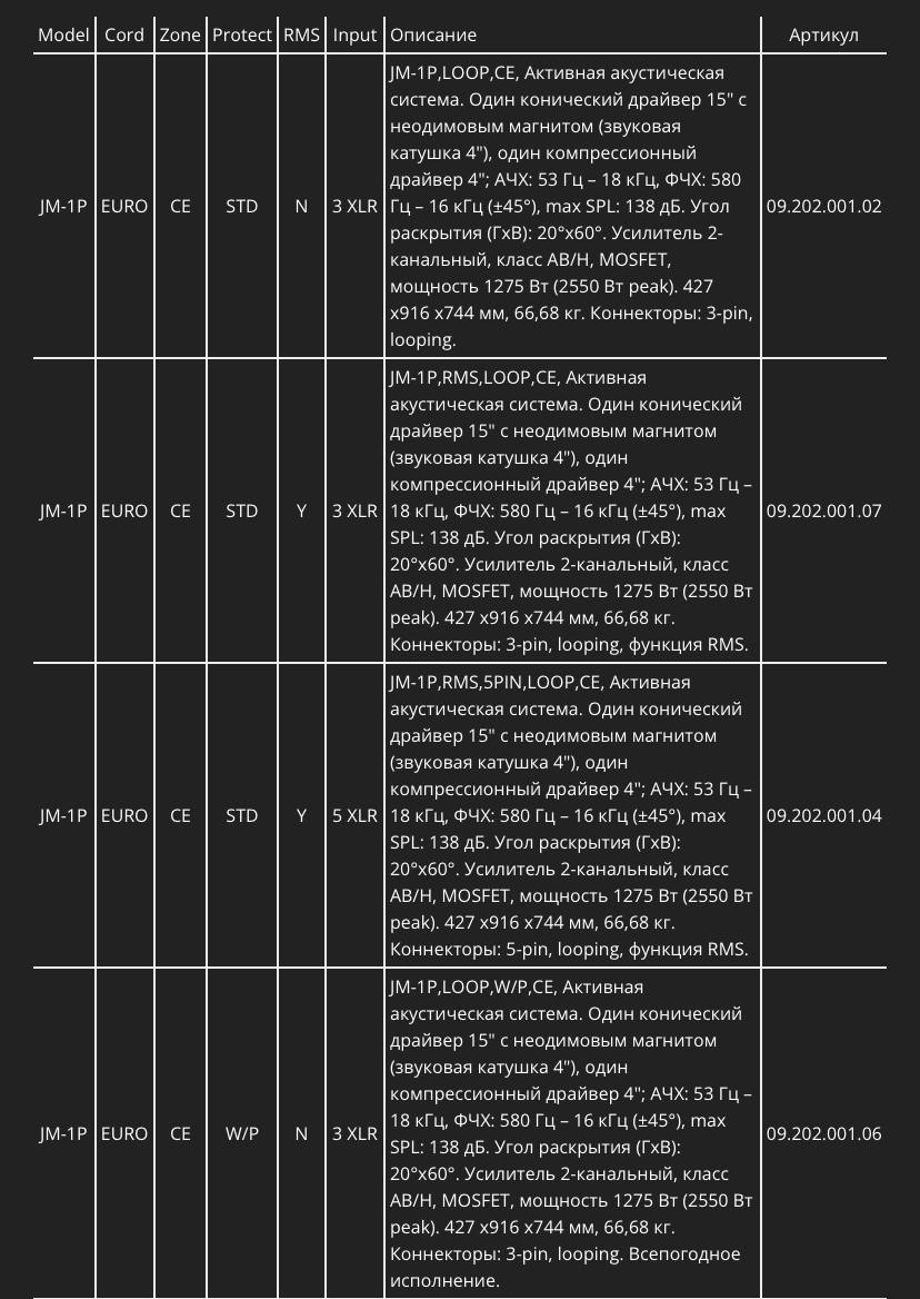 JM-1P – это активная высококачественная аудиосистема, которую можно собрать в массив, и которая подходит для самых разных инсталляций. Благодаря фирменной технологии Meyer Sound REM и трапециевидному корпусу эти громкоговорители можно собирать в плотные кластеры с дисперсией, соответствующей числу громкоговорителей. Несмотря на то, что JM-1P оптимизированы для горизонтального размещения, их можно также размещать вертикально при необходимости. За счет масштабируемости и удобной системе крепления QuickFly эти громкоговорители можно использовать в турах, сдавать в аренду или же установить стационарно. Модель играет в диапазоне 53 Гц – 18 кГц и отличается ровным звучанием с достаточным динамическим диапазоном в низкочастотной области. Эти громкоговорители получили 15” длинноходный низкочастотный драйвер и 4” компрессионный высокочастотный излучатель с технологией REM, вписанный в точно просчитанный рупор. Отличительная особенность модели – этот самый Q-рупор, обеспечивающий дисперсию по горизонтали в 20° и в 60° по вертикали. Равномерный полярный отклик и трапециевидный корпус позволяют собирать из этих громкоговорителей кластеры, практически избегая пересечения высокочастотных потоков. Работает с сабвуфером 700-HP и системами 1100-LFC или 900-LFC. Используется в качестве основной системы или же в качестве центрального или боковых каналов в крупных системах.