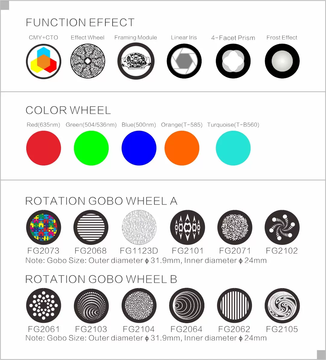 Колесо гобе: 2 вращающихся шаблона, 12 стеклянных шаблонов, эффект динамического наложения, можно вставлять и заменять, можно реализовать вращение, поток, эффект дрожания;