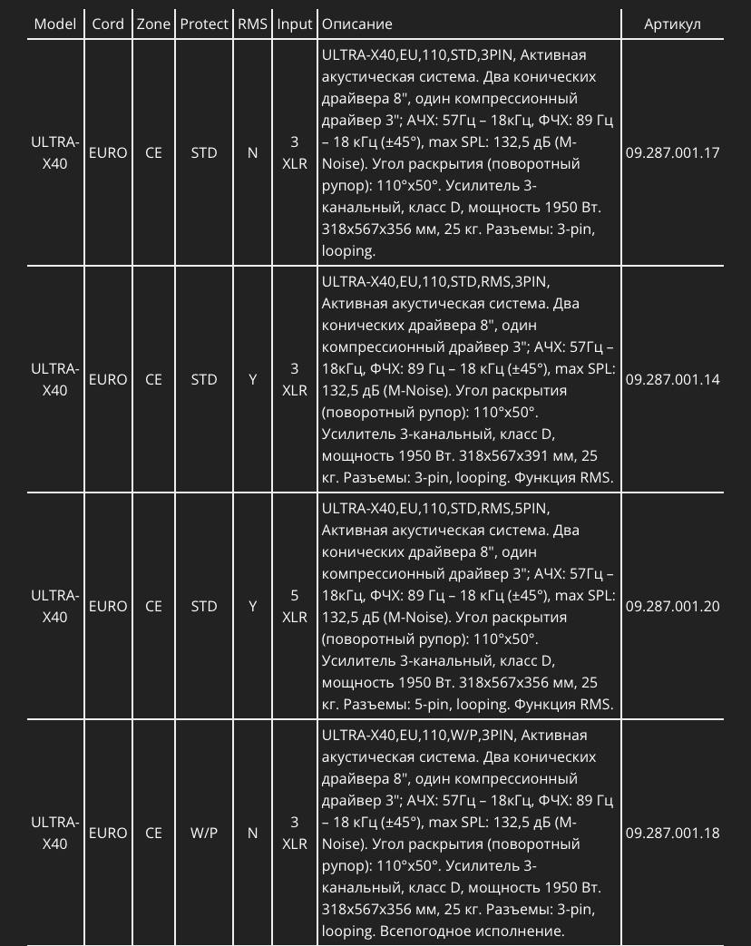 ULTRA-X40 задает новый стандарт соотношения мощности и габаритов, благодаря ультраэффективному 3-канальному усилителю D-класса, развивающему 1950 Вт пиковой мощности при максимальном постоянном потреблении тока всего 1,3 А (230 В). Этот усилитель позволяет развивать линейный пиковый SPL 130,5 дБ (измеренный в свободном поле на расстоянии 1 метр на тестовом сигнале Meyer Sound M-Noise). И все это в громкоговорителе размером 32 х 55,8 х 35,5 см, при весе менее 25 кг, что на 9 кг меньше веса предшественника этой модели — громкоговорителя UPA-1P.