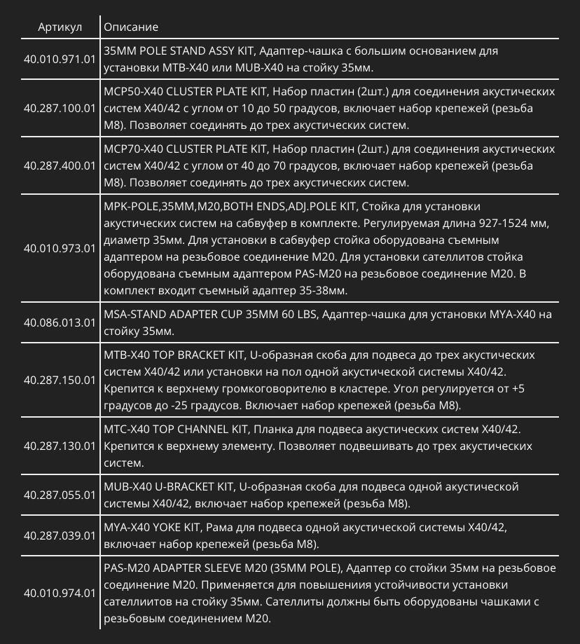 Раньше о таком можно было только мечтать. ULTRA-X40 оснащается развитой системой аксессуаров для подвеса и монтажа. Ручку для переноски, удобную в мобильном применении можно убрать при долговременной инсталляции. 11 встроенных точек подвеса с креплением М8 и интегрированный стакан под стойку 35 мм значительно расширяют возможности использования. Так же в виде опций доступны регулируемые по высоте штанги, U-образная скоба, скоба типа yoke с возможностью регулировки наклона, соединительные пластины для монтажа систем в вертикальный кластер и монтажные платы для сбора горизонтальных кластеров.
