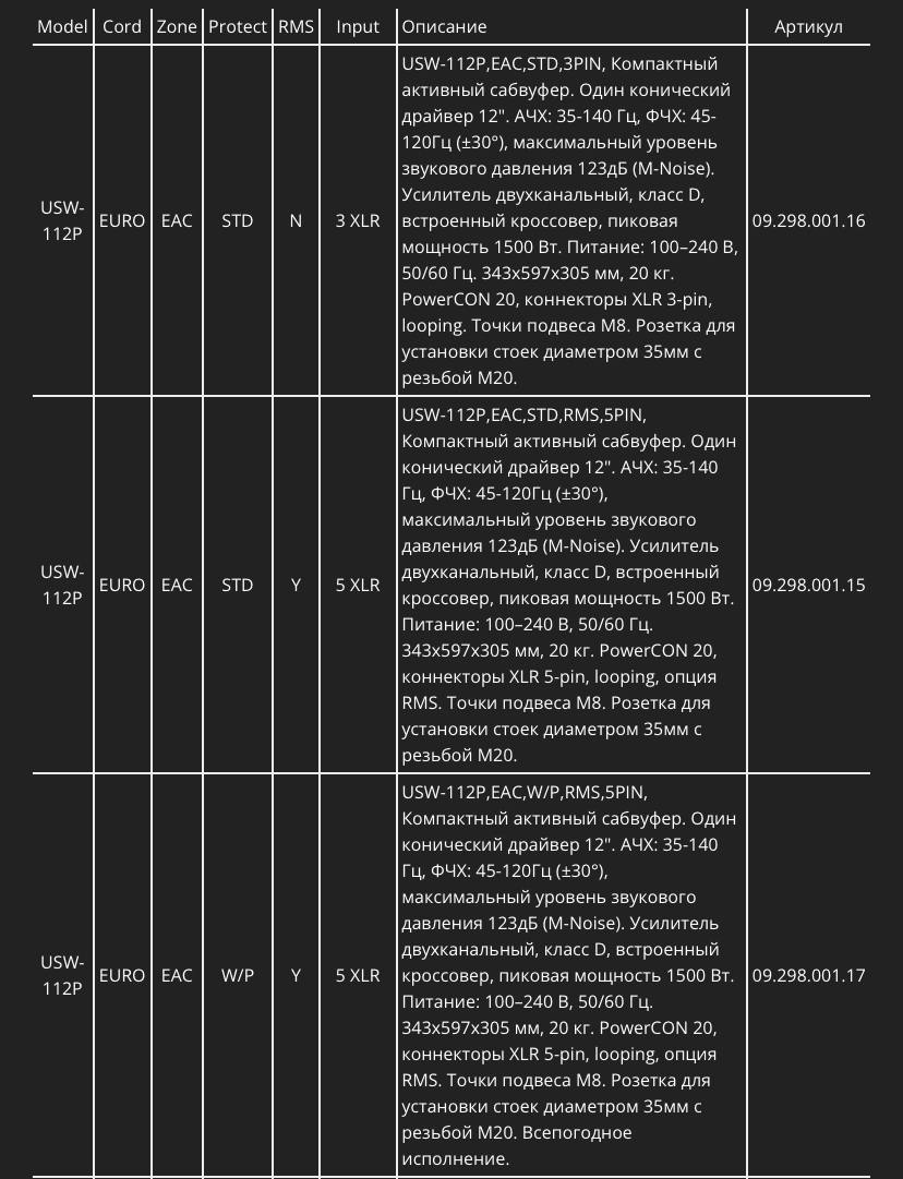 Встроенный в USW-112P усилитель класса D обеспечивает 123 Дб линейного пикового SPL, при тестировании на M Noise. Сложный процессор обработки сигнала включает фильтры для коррекции фазовой и частотной характеристик и схему защиты динамика. Встроенный кроссовер дает возможность подключать широкополосный сигнал, позволяя включать все компоненты системы в простую последовательную цепь и устраняет необходимость использования внешних кроссоверов в небольших системах.