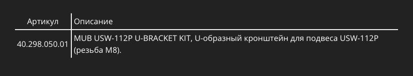 Благодаря своему небольшому весу (всего 21 кг) USW-112P подходит для широкого спектра применений, от церквей и клубов до ресторанов и небольших театров. Возможна вертикальная или горизонтальная ориентация; его две интегрированные точки крепления M8 позволяют использовать опциональный U-образный кронштейн для крепления на стену, потолок или ферму. Другая опция предлагает встроенный стакан 35 мм для монтажа стойки с резьбой M20 для большей устойчивости.