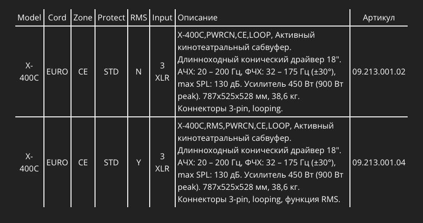 X-400C особенно актуален в тех случаях, когда от низких частот требуется потрясающая воображение мощь. Независимо от того, используется один или несколько сабвуферов, компактные размеры позволяют использовать X-400C в небольших кинотеатрах, кинозалах и студиях пост-продакшна.