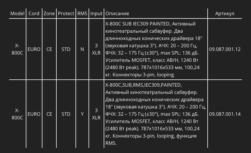 X-800C оснащён двумя высокоэффективными 18-дюймовыми длинноходными динамиками, размещенными в оптимально настроенном вентилируемом корпусе, обеспечивающем четкие переходные процессы вплоть до 20 Гц даже на очень высоких уровнях. Сложная встроенная система обработки сигналов включает фильтры фазовой и частотной коррекции, а частота на выходе находится ниже границы 250 Гц, что позволяет избежать возникновения комб-фильтров.